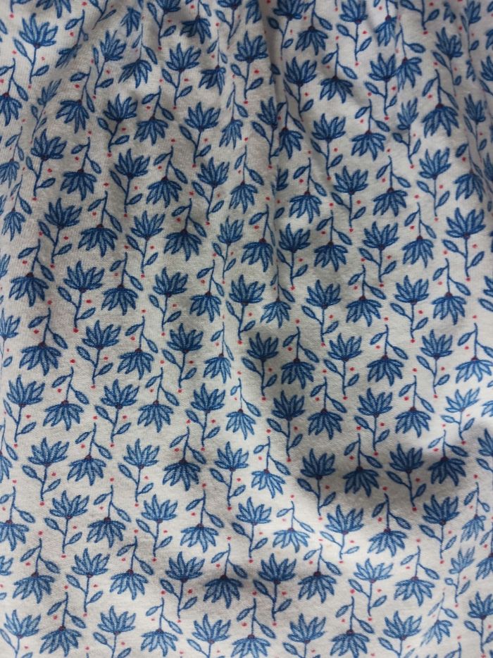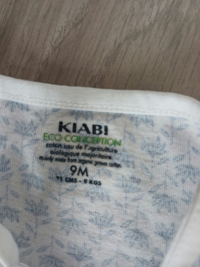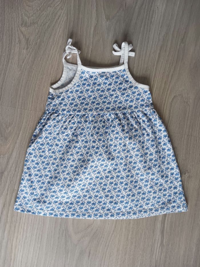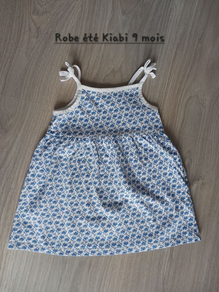 Petite robe été Kiabi 9 mois 71 cm, en coton biologique. Blanche avec des fleurs bleues.
