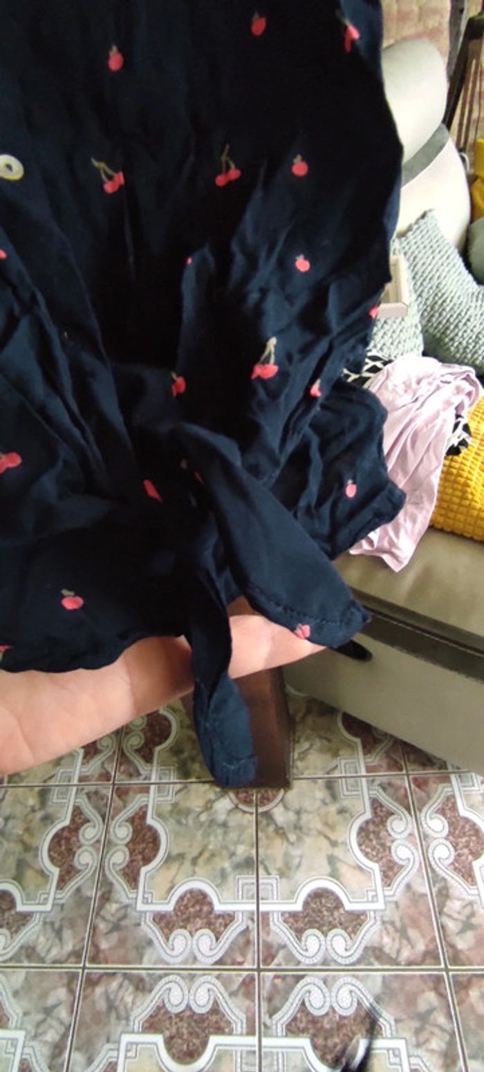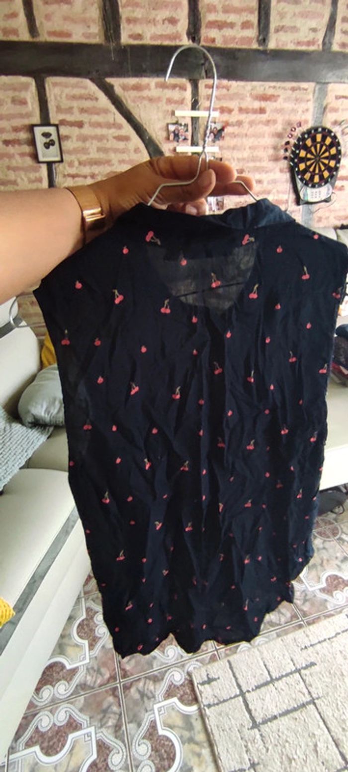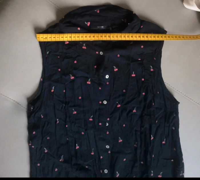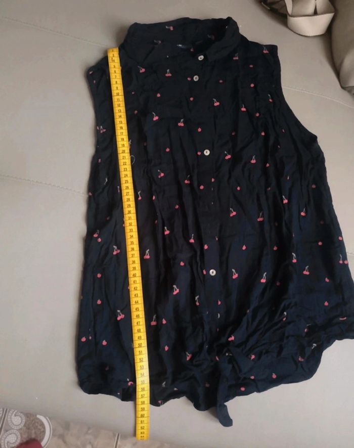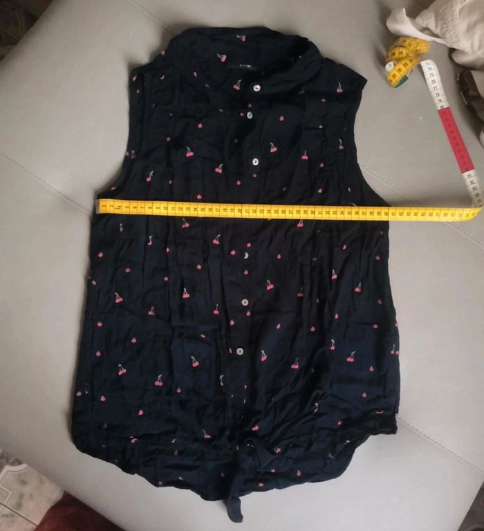 Top taille M Marque kiabi Motif cerises 🍒 Mesures sur les trois dernières photos Couleur bleu marine Noeud en bas des boutons , attache ventrale Envoi rapide