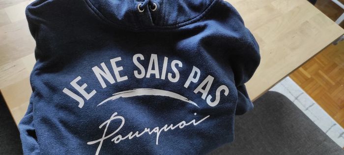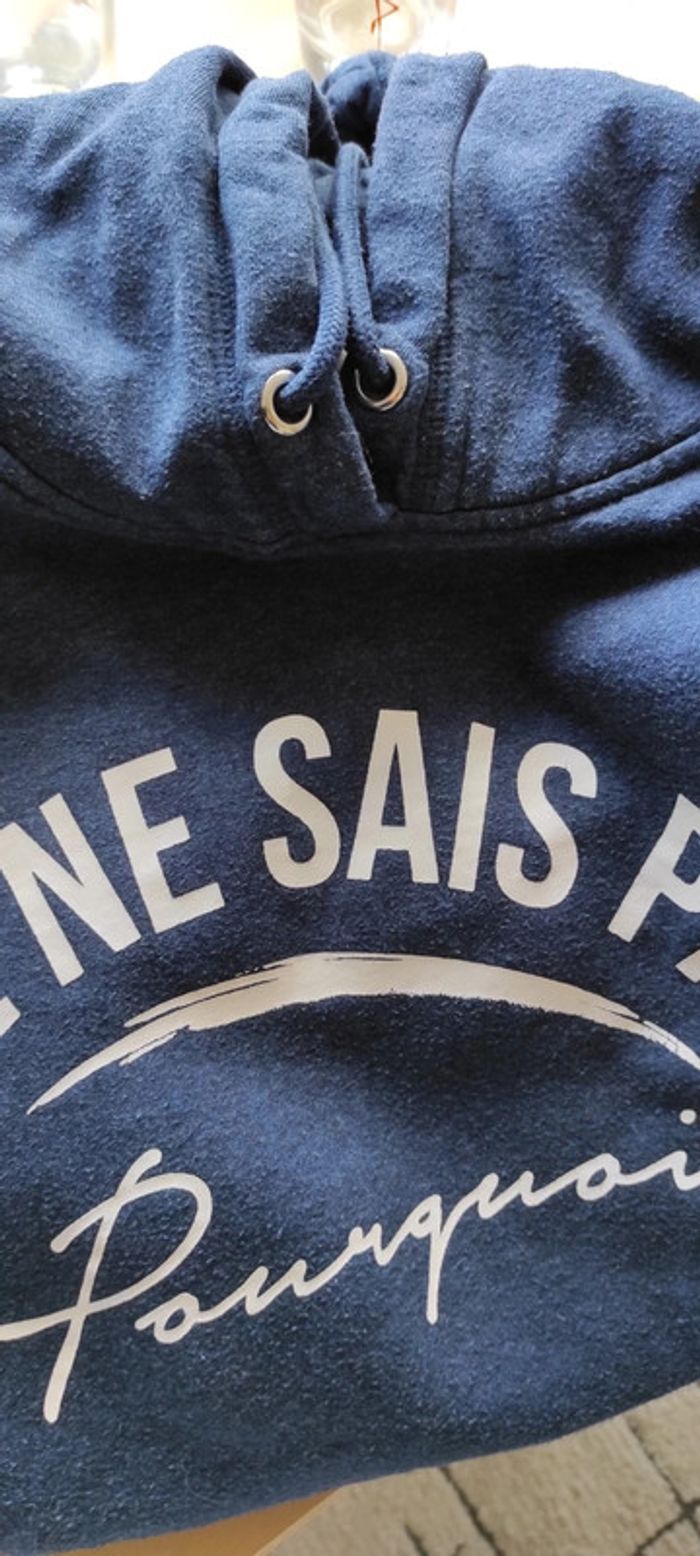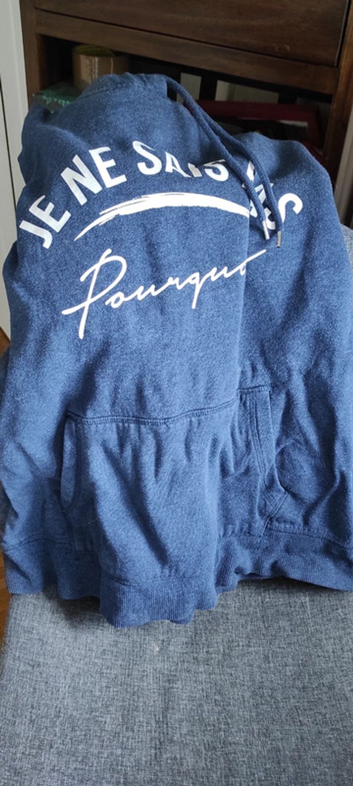En très bon état Pas d'accroc pas de souci Bleu et blanc Inscription: je ne sais pas pourquoi Marque h&m Taille L Capuche Cordon impeccable Prix d'origine 29.99€ (facture disponible sur demande )