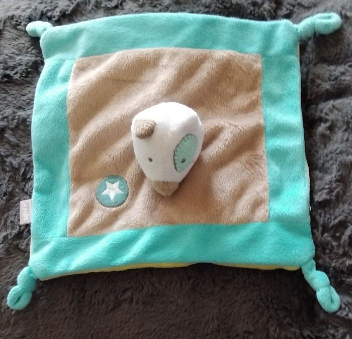 Doudou carre plat en velours de couleurs bleu cian et marron L autre côté en velours de couleur jaune Souris sur le milieu du doudou et écusson avec étoile brodés sur le doudou Nœud dans chaIe coin du doudou