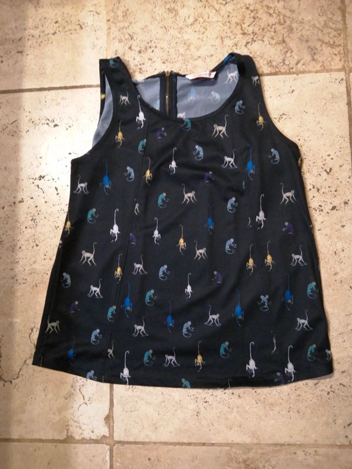 Débardeur léger avec motifs singes multicouleurs. Fermeture dans le dos étiquette de taille coupée