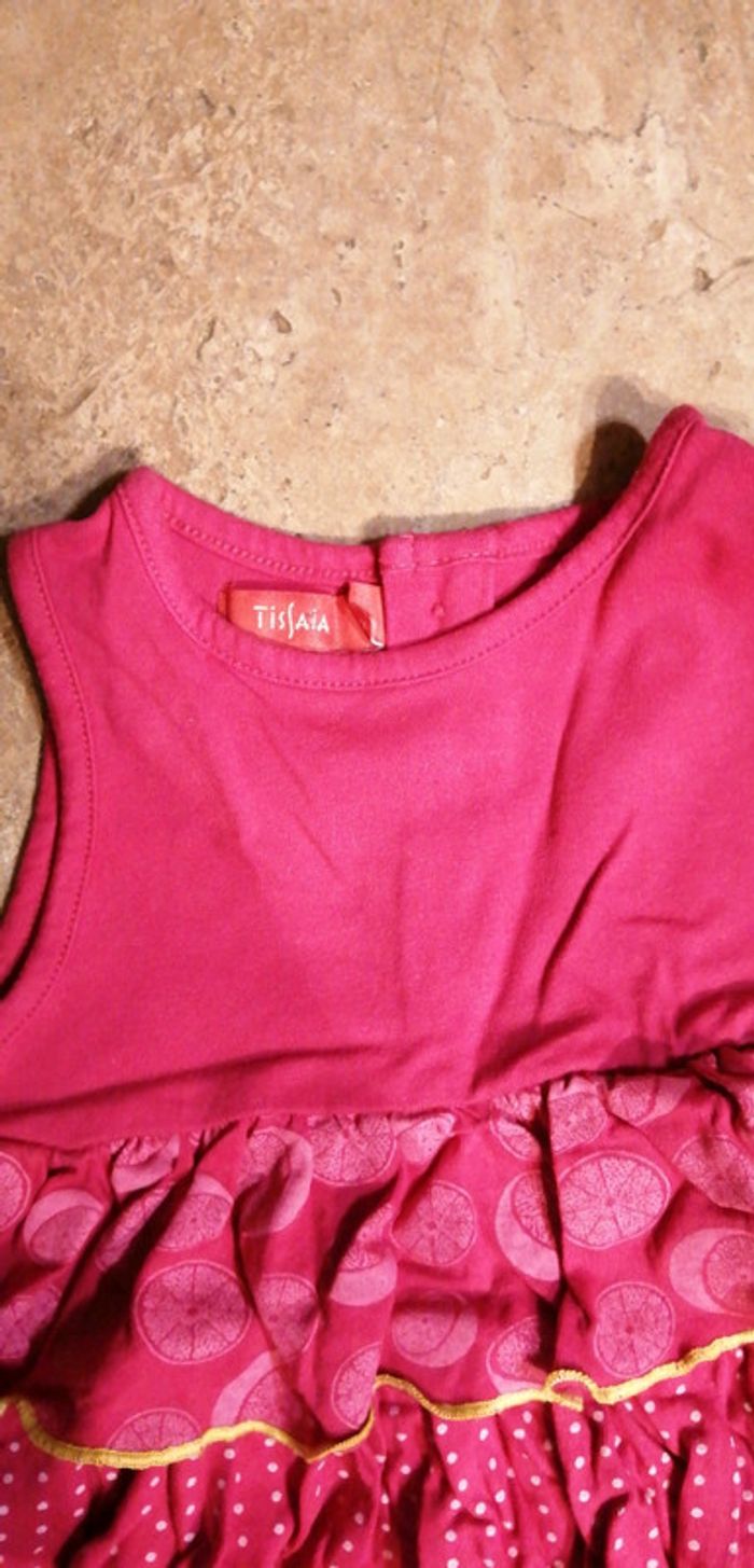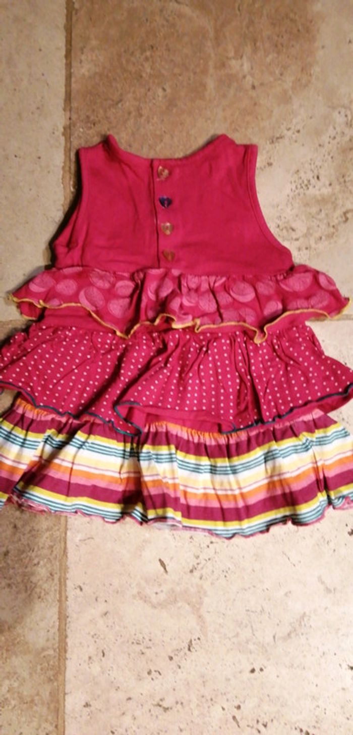 Robe multicolore sans manches à volants. Boutonnage dans le dos