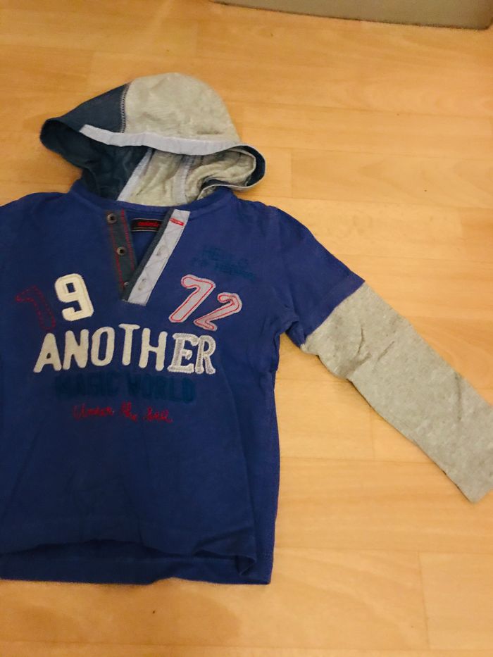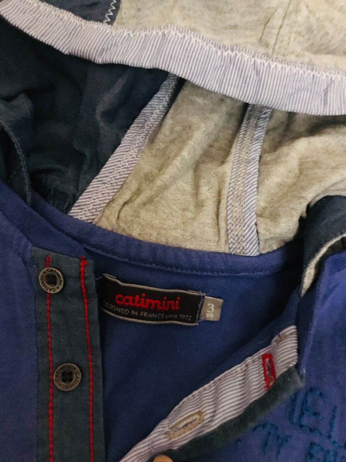 t-shirt garçon taille 3 ans Catimini couleur bleu, gris et rouge à capuche très bon état