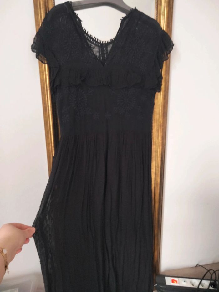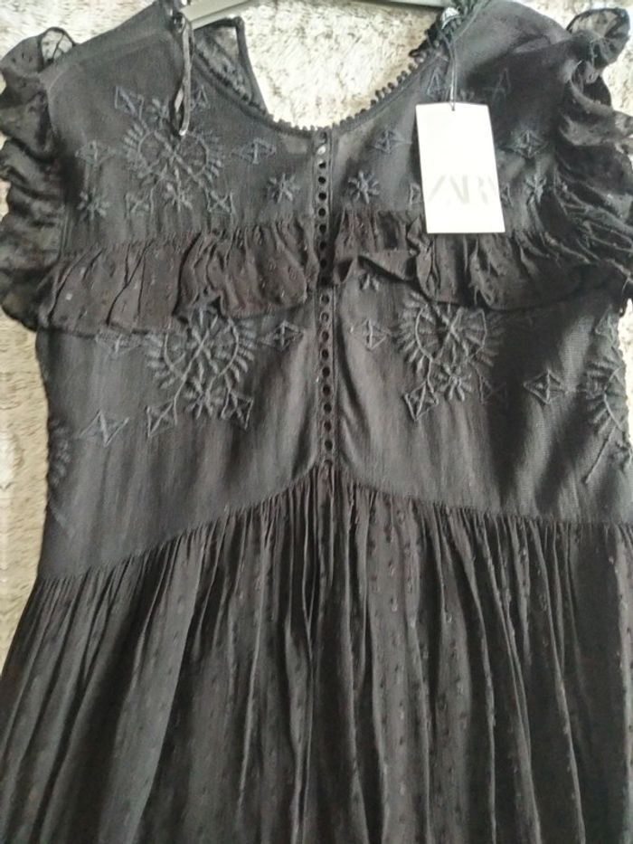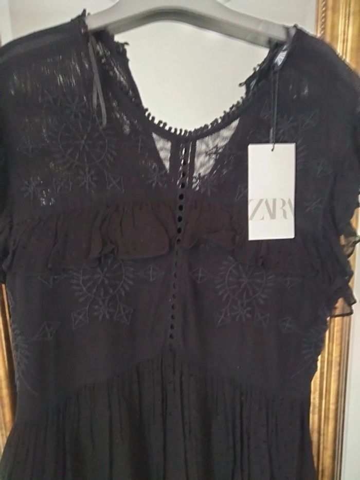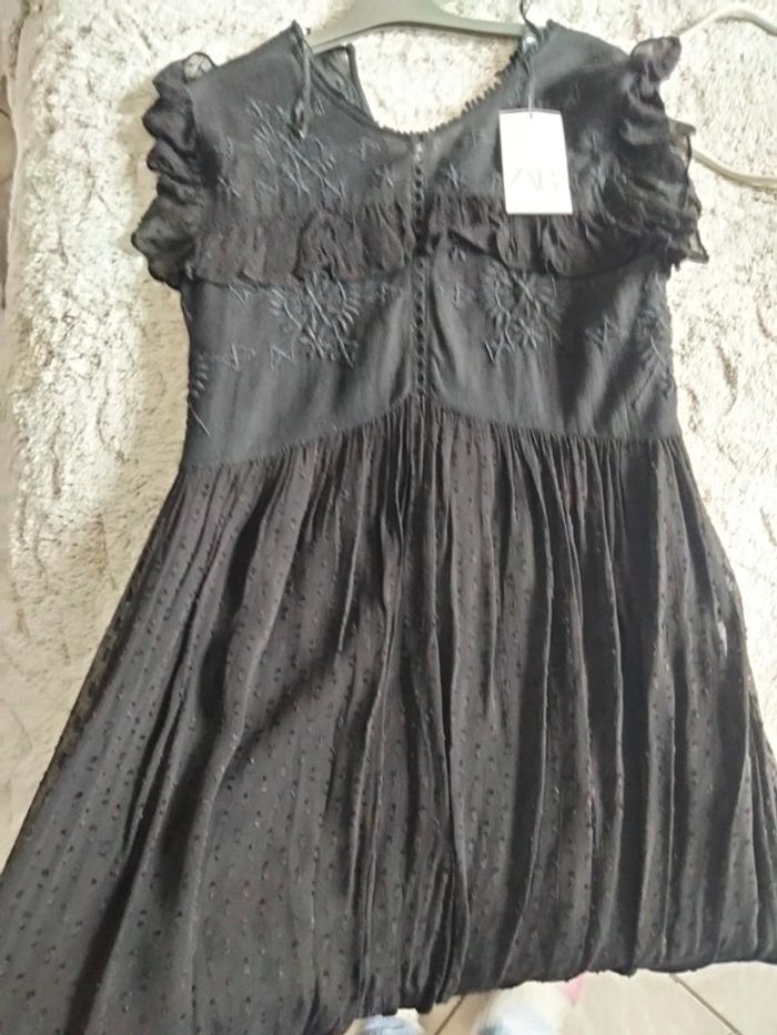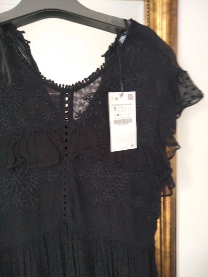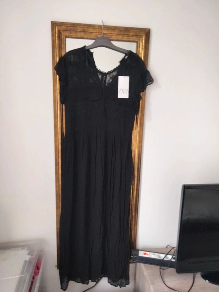 Robe longue Zara noir Taille s Neuve avec étiquette Jamais portée Attention il y a un défaut Cf photo je l'est repriser a un endroit car défectueuse je voulais la mettre puis finalement elle ne me va plus regarder bien les photos merci