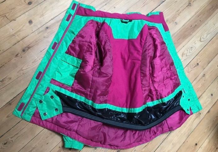Blouson de ski vert vif , rose fuchsia et blanc 2 petites bandes réfléchissantes dans le bas du dos jupe intérieur poches zippées et poche forfait sur la manche taille 12 ans stature 146/152 cm Crivit État proche du neuf sauf qu’il manque la capuche