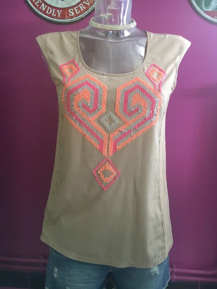 Débardeur large grain de malice beige orange rose sequins - photo numéro 1
