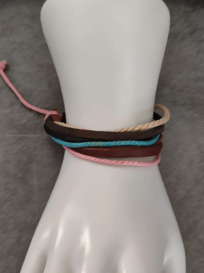 bracelet fantaisie réglable en cordeletettes multicolores et lanières simili cuir. - photo numéro 2