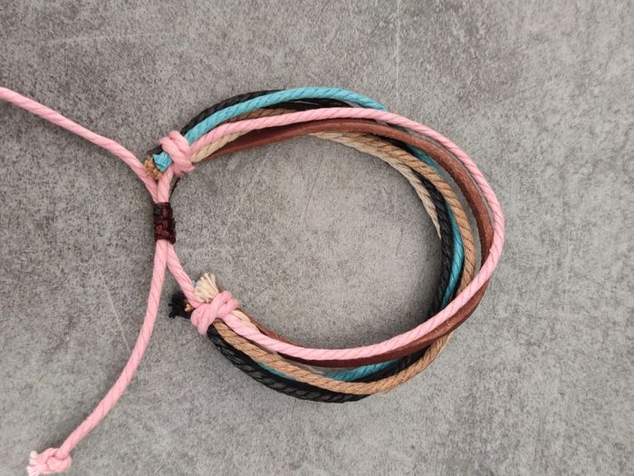bracelet fantaisie réglable en cordeletettes multicolores et lanières simili cuir. - photo numéro 1