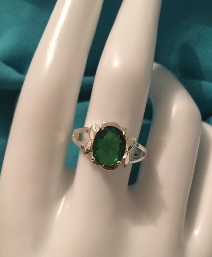 Bague fantaisie métal argenté et pierre verte émeraude - photo numéro 1