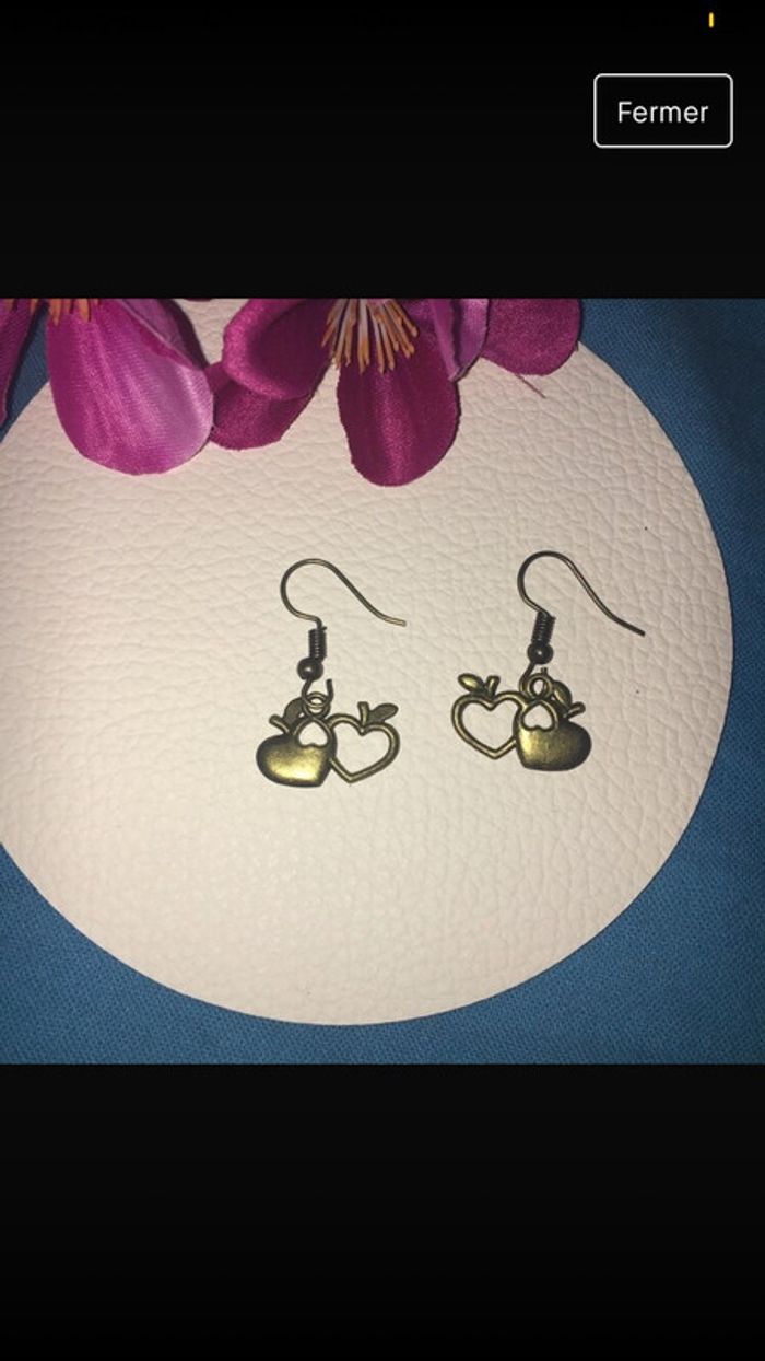 boucles d'oreilles pendantes fantaisie métal doré vieilli coeurs pomme amour love