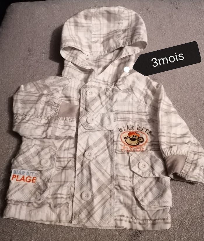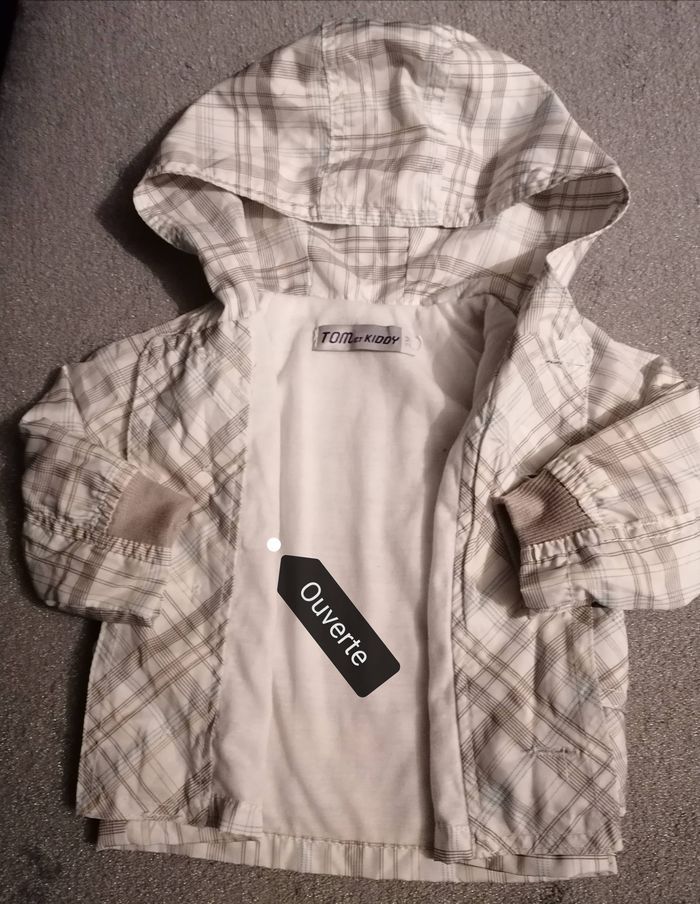 Veste avec capuche bébé garçon Marque :tom & kiddy 100% polyester Age 3mois Couleur blanche à carreaux Manche longue, 2 poches sur les côtés Portée une fois, aucune tache 5€