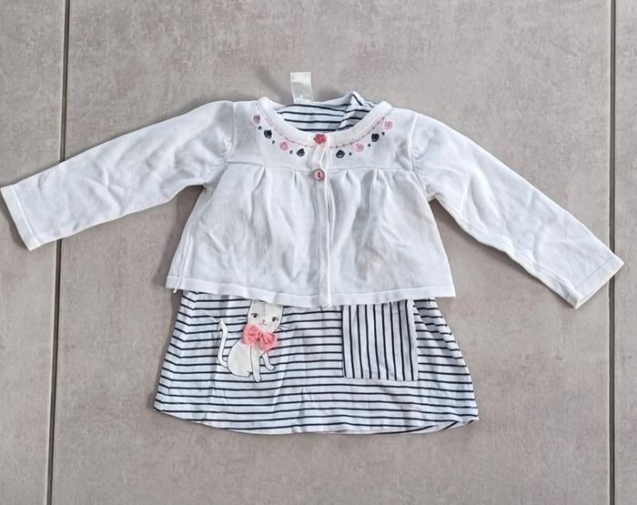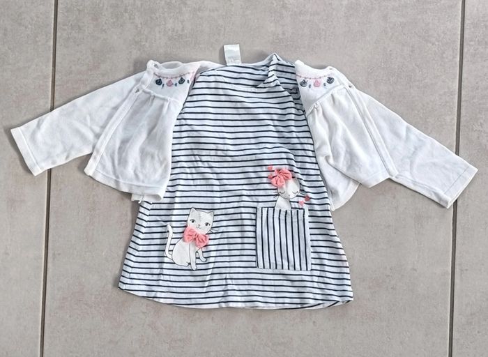 Robe d'été avec son petit gilet (style marin) avec des petits chats (différentes marques). Petite tâche sur le bas de la robe (voir photo 6) Taille 12 mois #12moiseloise83125