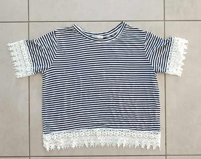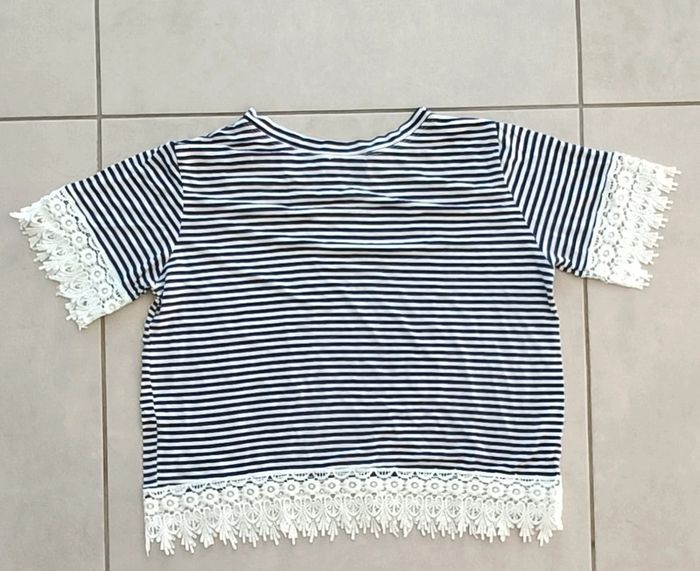 Haut manches courtes rayé marin avec de la dentelle Plus l'étiquette de la taille mais taille 42/44, si vous souhaitez des mesures, n'hésitez pas. #femmeeloise83125