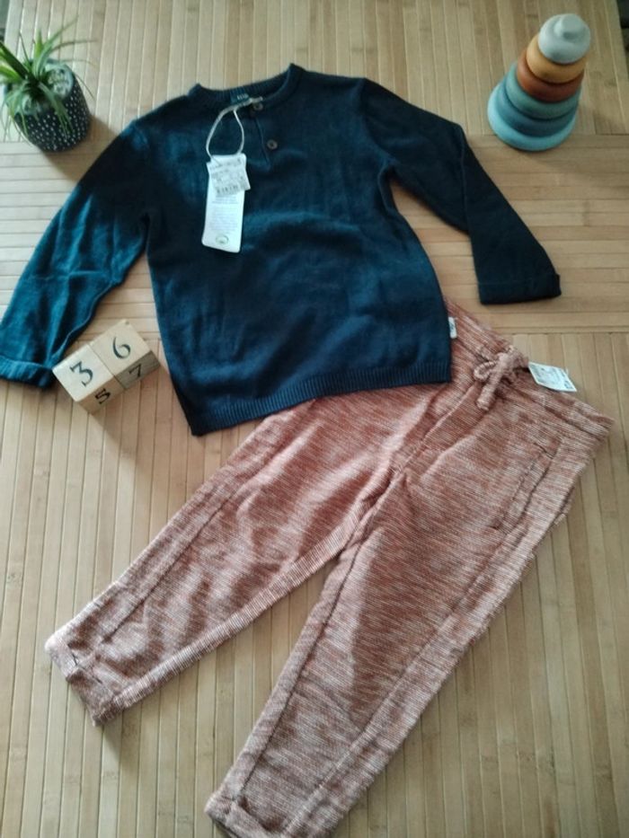 Ensemble composé d'1 pull marine col boutonné et d'1 pantalon souple matière effet sympa marron/rouille chiné Neuf avec étiquette idéal pour offrir