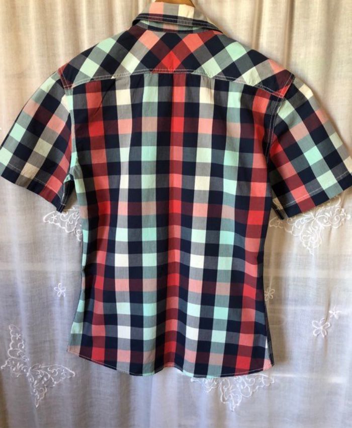 Chemise à carreaux Tons bleu marine blanc bleu turquoise et rouge Manches courtes 2 poches poitrine avec rabats Taille S Celio Carrure 45 cm Largeur à plat sous les bras 47,5 cm Longueur 64,5 cm
