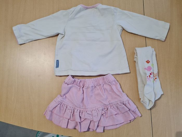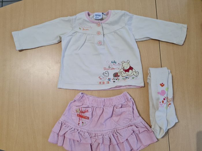 Je vends un ensemble pour fille en taille 12 mois de la marque disney composé d'une jupe, d'un t shirt et d'une paire de collants. Très bon état