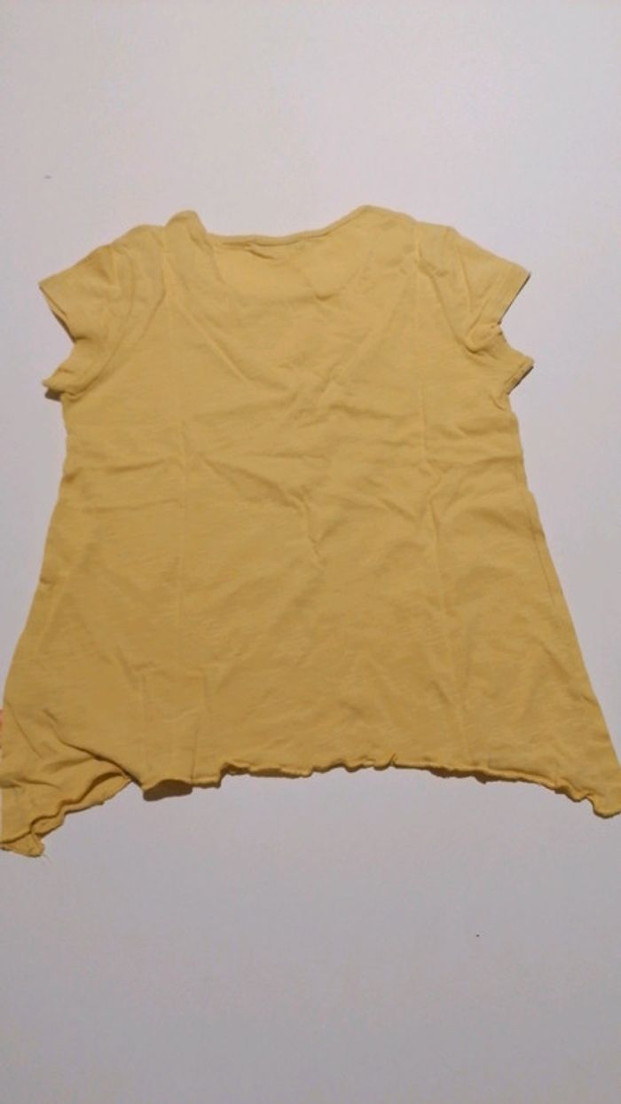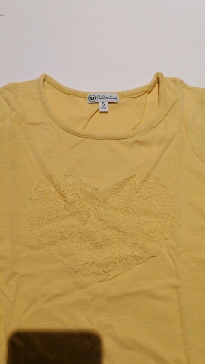 Bonjour Voici un t-shirt jaune collection taille 5 ans avec détail hanches plus longues et cœur en dentelle en parfait etat
