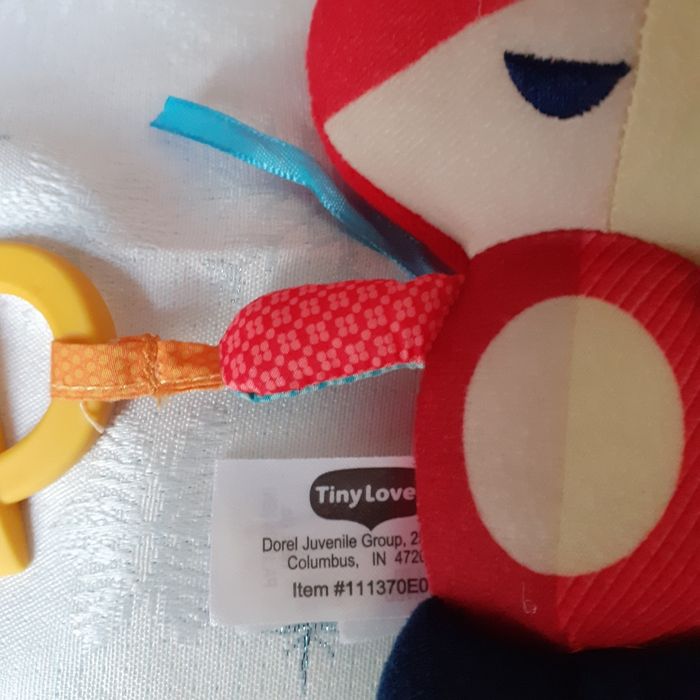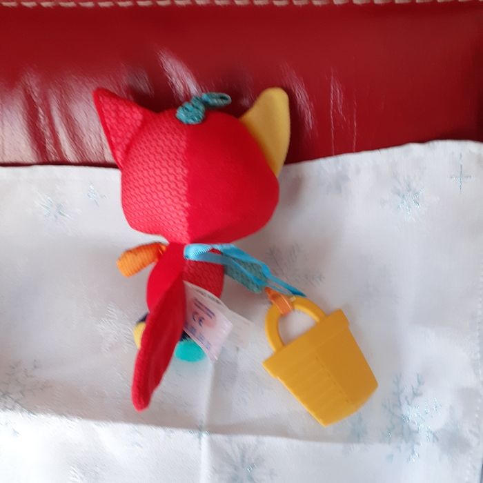 Doudou entièrement rembourré; yeux-nez-bouche brodés; multicoloris; bruit de grelot quand on le secoue; vibre quand on tire sur le lien au dessus de la tête. Petit seau en plastique à mâchouiller. Hauteur totale de 16 cm // voir photos pour détails