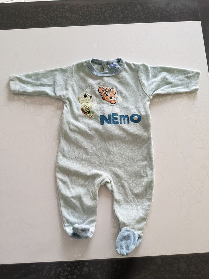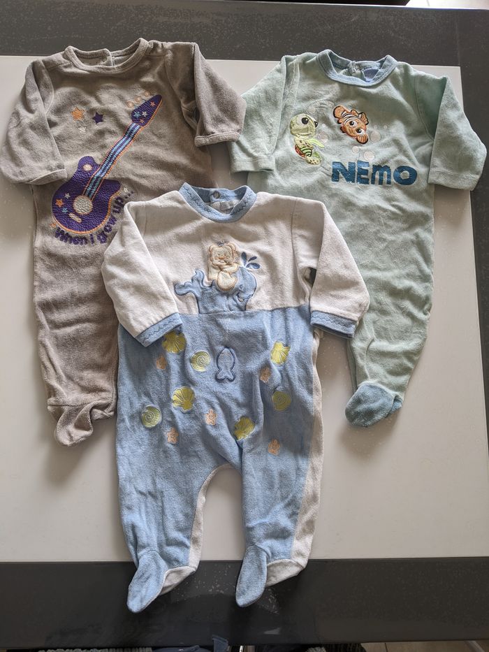 Lot de 3 pyjamas taille 6 mois 1 bleu - vert Disney "Nemo" taille 6 mois 1 gris rock Vertbaudet taille 9 mois (mais taille réelle plutôt 6!) 1 blanc et bleu Kimbaloo taille 6 mois Tous en très bon état