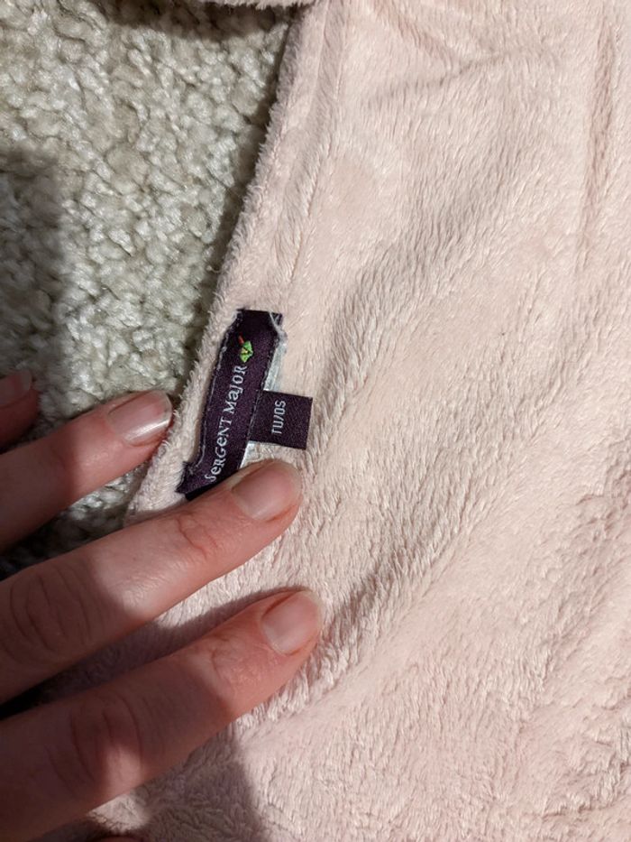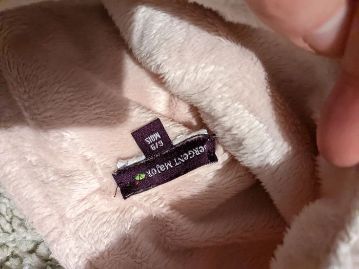 Taille 6-9 mois mais extensible car ma fille l'a porté jusqu'à ses 10 mois (et elle a un tour de tête standard). Très bon état (juste qq bouloches). Couleur rose pastel avec petit noeud