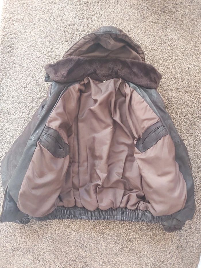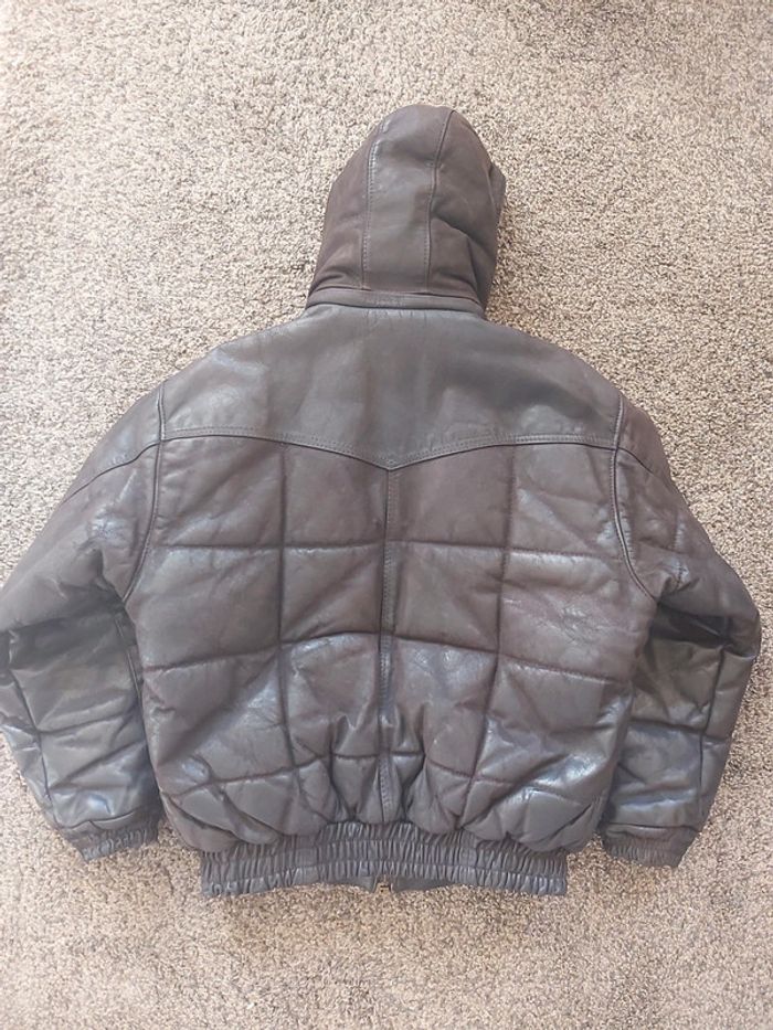 Doudoune manteau homme vintage années 90" cuir d'agneau marron avec capuche et col fausse fourrure détachable provenance Paris reconditionné doublure et poches refait, nettoyage complet intérieur extérieur plus nourrissage du cuir taille M très bon état