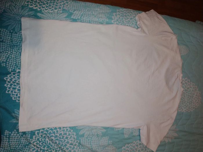 #hommelizen93 T-shirt blanc avec manches courtes Le blanc est moins éclatant que neuf mais encore blanc. Petite tâche peu visible voir dernière photo. Envoi rapide