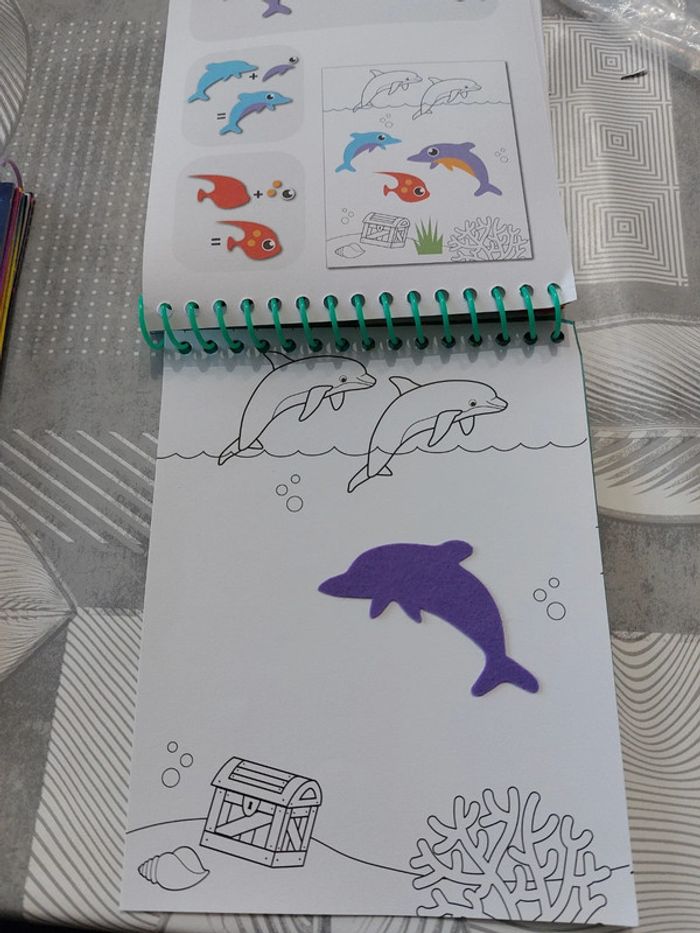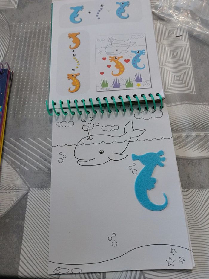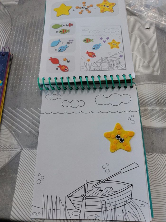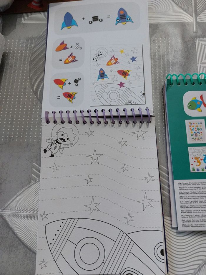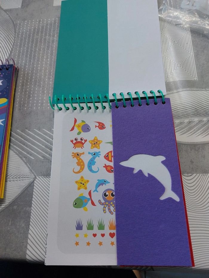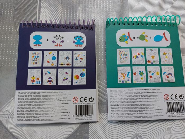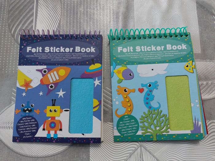 Livre d'autocollant en feutrine pré découpé. Notice à chaque page (voir photo 4) Le livret sur l'espace est neuf. Le livret sur la mer a été commencé sur 3 pages (voir photos 5,6 et 7) Bricolage pour enfant
