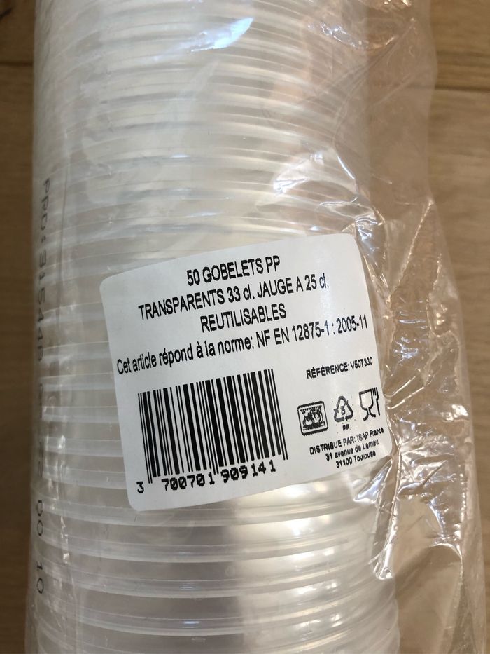 Gobelets en plastiques taille 33cL jauge à 25cL. Un pack neuf dans son emballage (50 gobelets), et environ 50 gobelets neufs mais hors de leur emballage.
