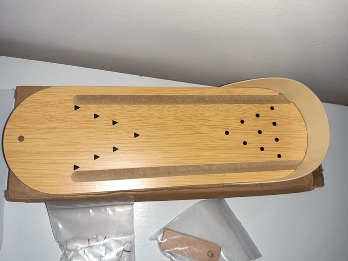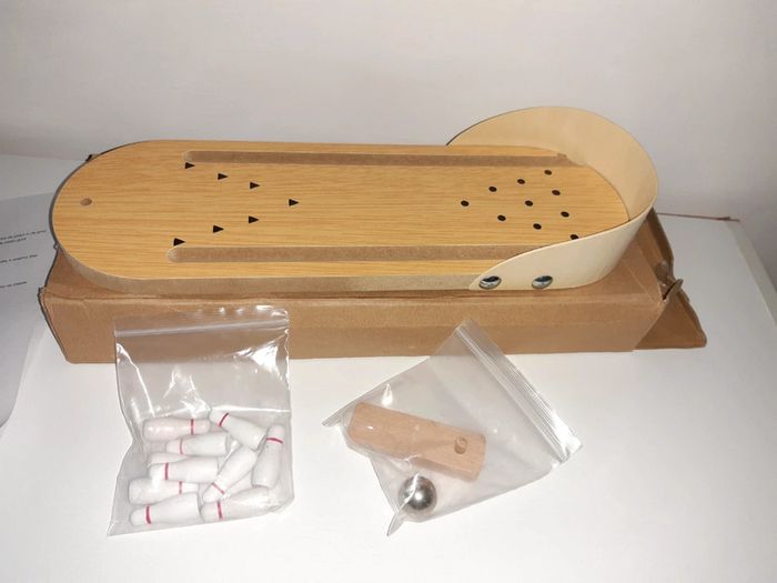 Jeu de bowling de table. Longueur de la piste 30cm. Largeur 10cm. En bois. Complet dans la boîte d origine avec les quilles, la boule, notice.