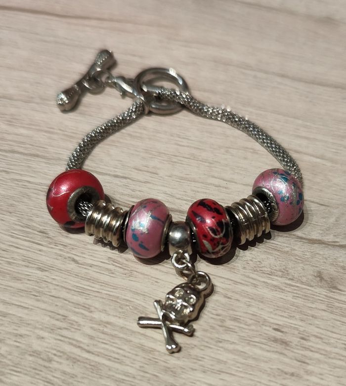 Bracelet argenté avec perles breloques pendentif crâne et fermoir atypique - photo numéro 1