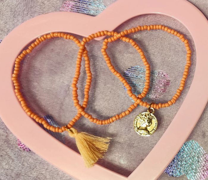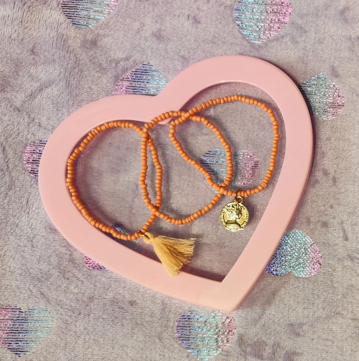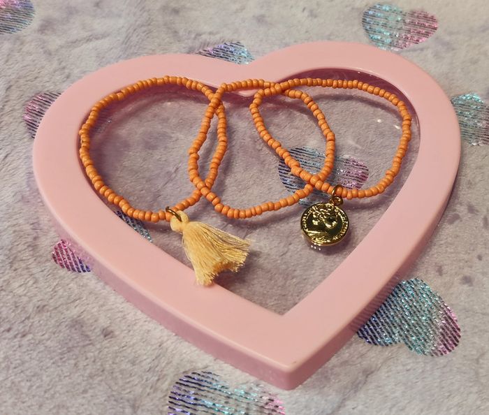 Lot de 3 bracelets élastiques avec perles oranges et breloques dorées. Neuf sans étiquette ni emballage. #mllejoysbijoux #mllejoysneuf