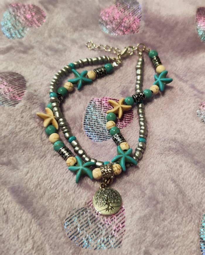 Bracelet de cheville bleu et blanc avec breloque arbre de vie ajustable. Neuf sans étiquette ni emballage. #mllejoysbijoux #mllejoysneuf
