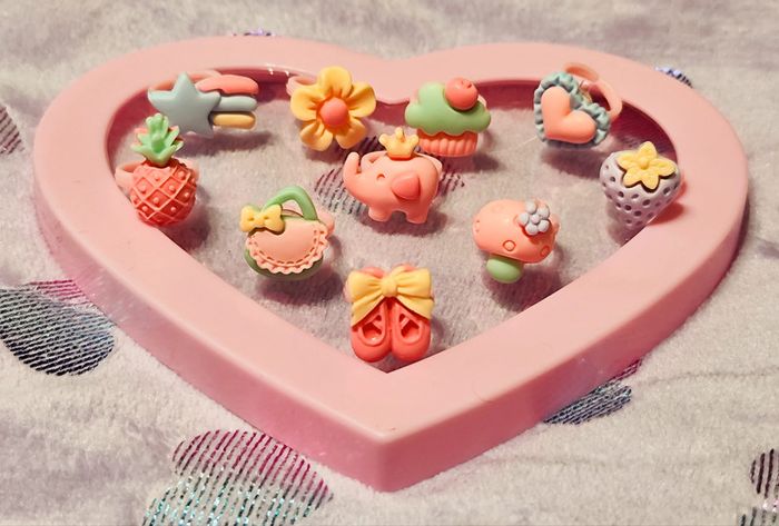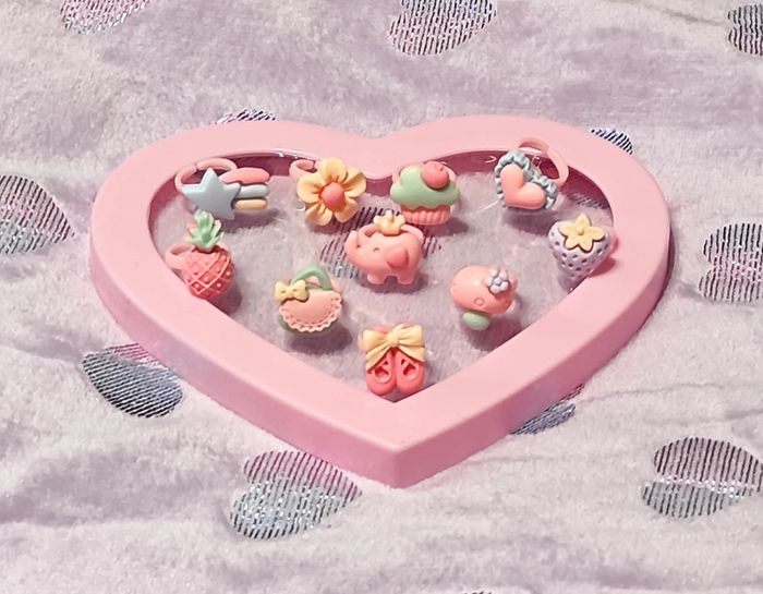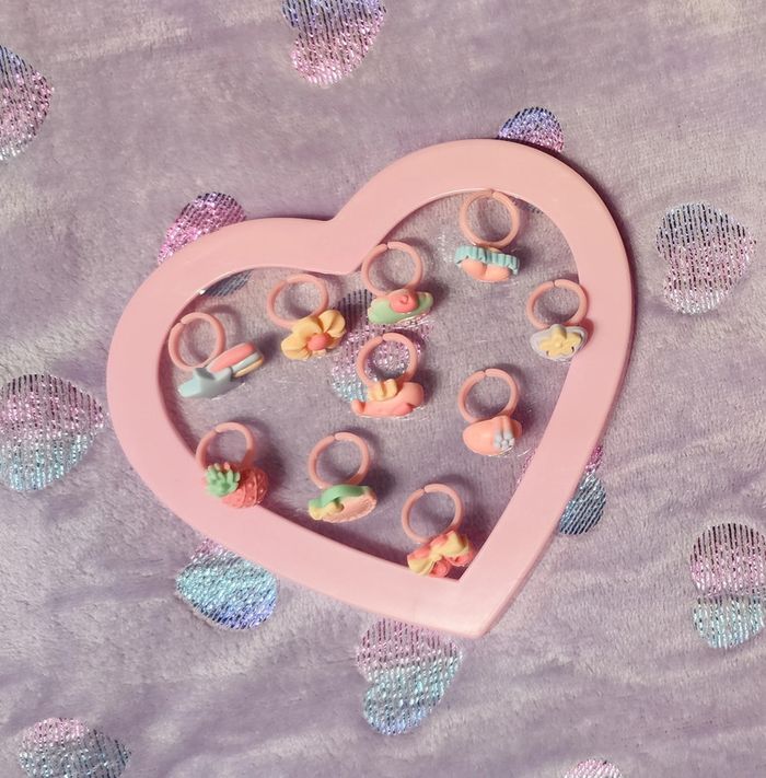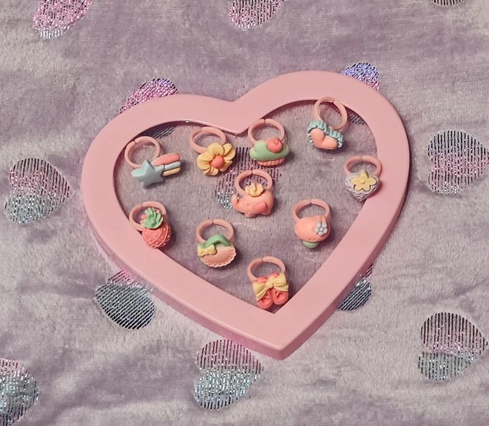 Joli lot 10 bagues plastiques pour enfants ajustables. Pour anniversaire, fête ou tout simplement collection. Neuf sans étiquette. Le gros cœur est une décoration, pas à vendre. #mllejoysjouets #mllejoysneuf