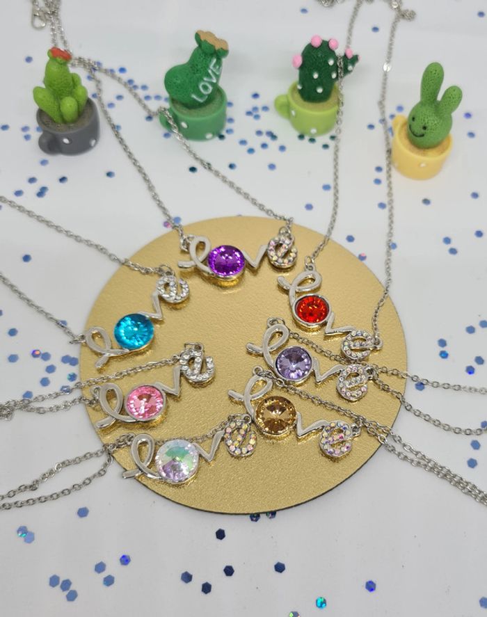 Lot de 7 colliers argentés avec pendentifs Love à pierre colorée. Ce sont des colliers fantaisies argentés, et non des colliers en argent. Parfait pour fêtes, anniversaires, kermesses, foires... Neufs sans étiquette ni emballage. #mllejoysbijoux #mllejoysneuf