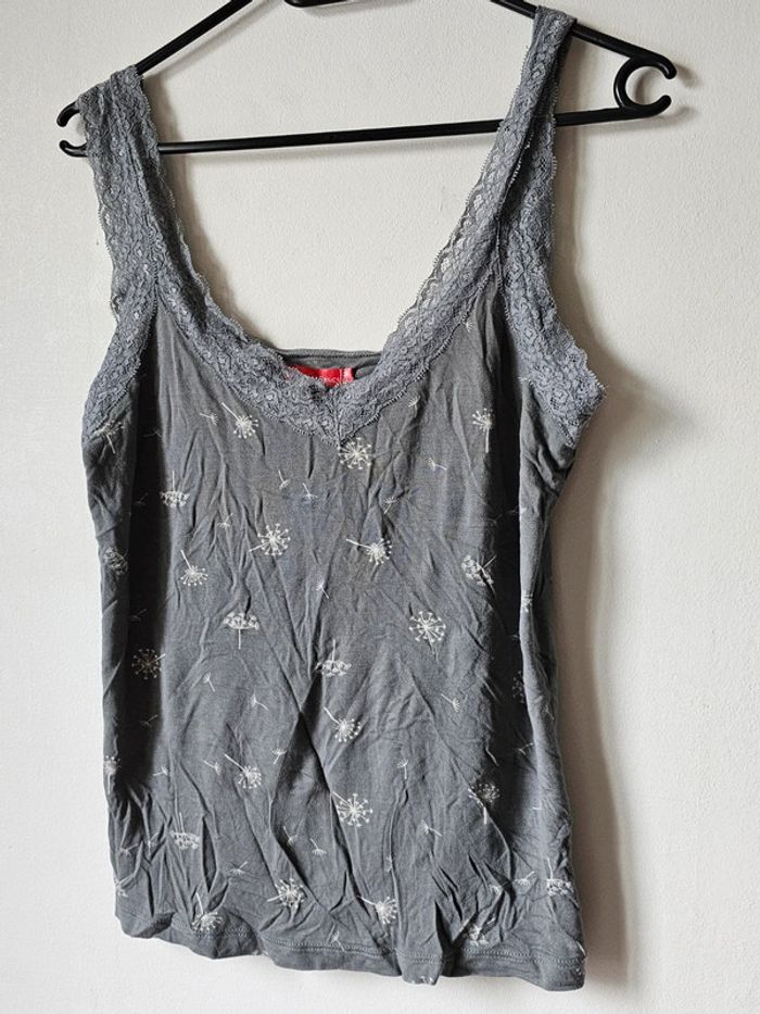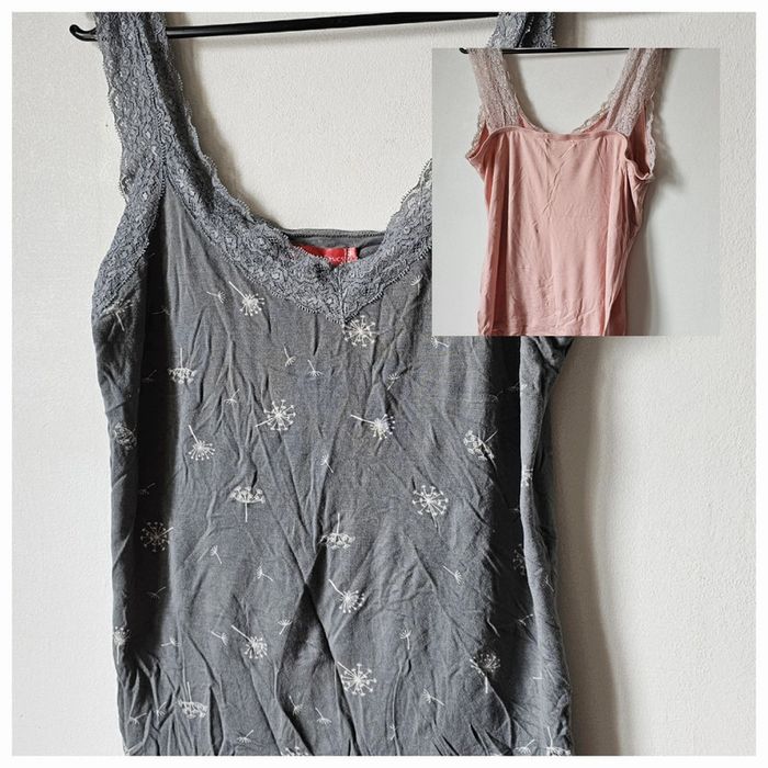 2 débardeurs en très bon état 96% viscose 4% Elasthane 1 rose et 1 kaki avec pissenlit Longueur totale 61cm Largeur aisselle a aisselle 45cm P1