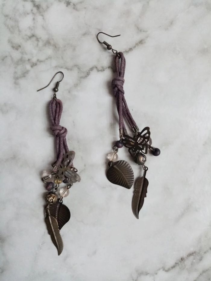 Boucles d'oreilles cordon marron, feuilles, papillons metals Très bon état #rachel62500bijoux