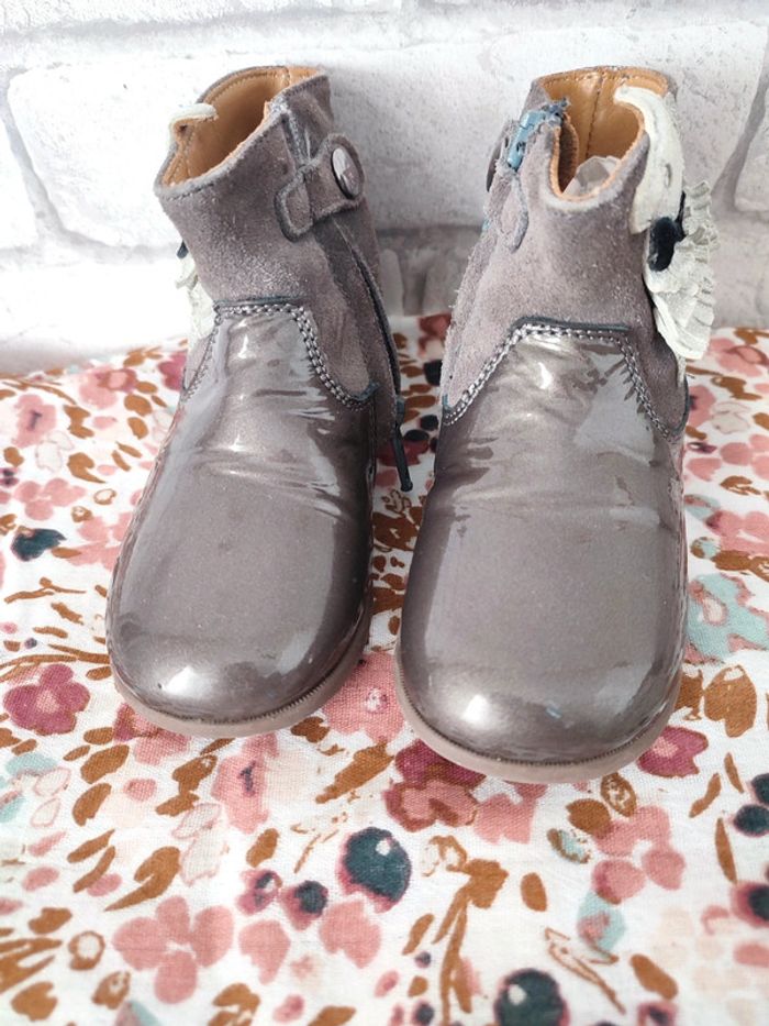 Jolies paires de bottines vernies grises avec franges. Fermeture par zip avec boite, très peu portée semelle 13.9 / pointure 23 remise activée sur les lots