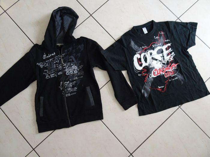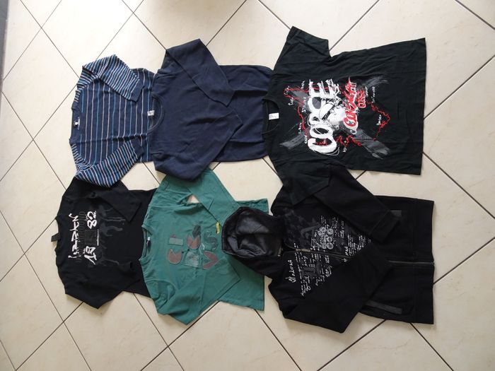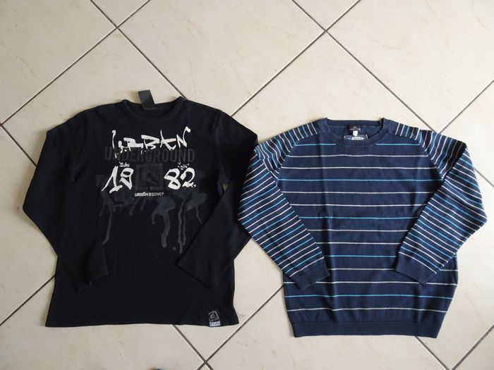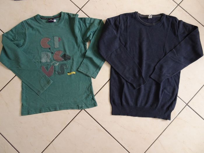 Lot de 6 articles enfant garçon âge 12 ans : une veste sweat zippée, un t-shirt, 2 pulls bleu marine, 2 t-shirts manches longues.