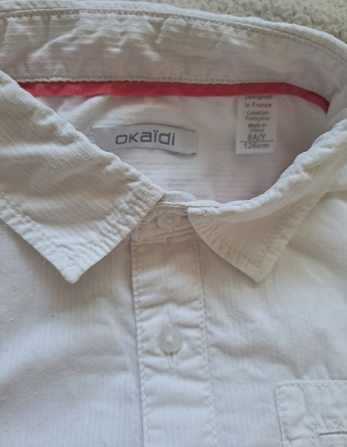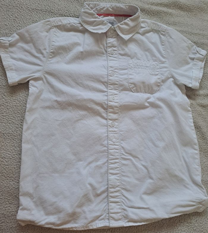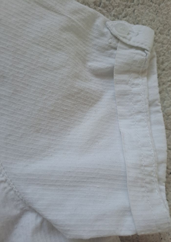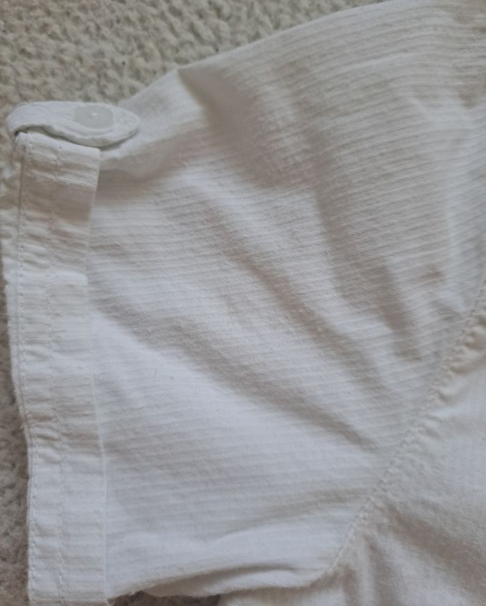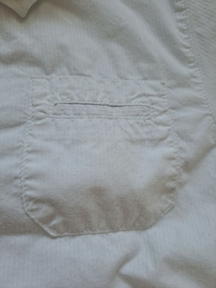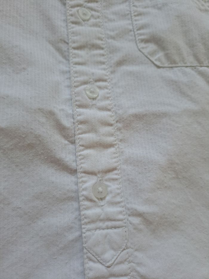 Manches courtes. Ferme avec 7 boutons. 1 bouton décoratif sur chaque manche. 1 poche sur la poitrine. Pas de trou. Quelques bouloches. Quelques tâches visibles en contre jour (voir photo).