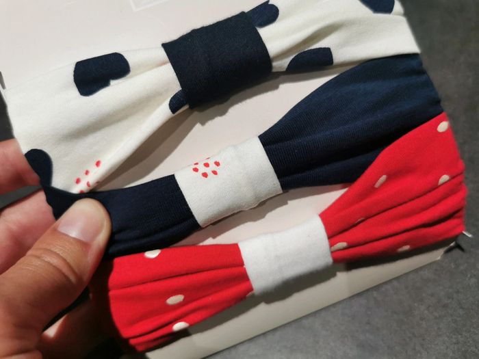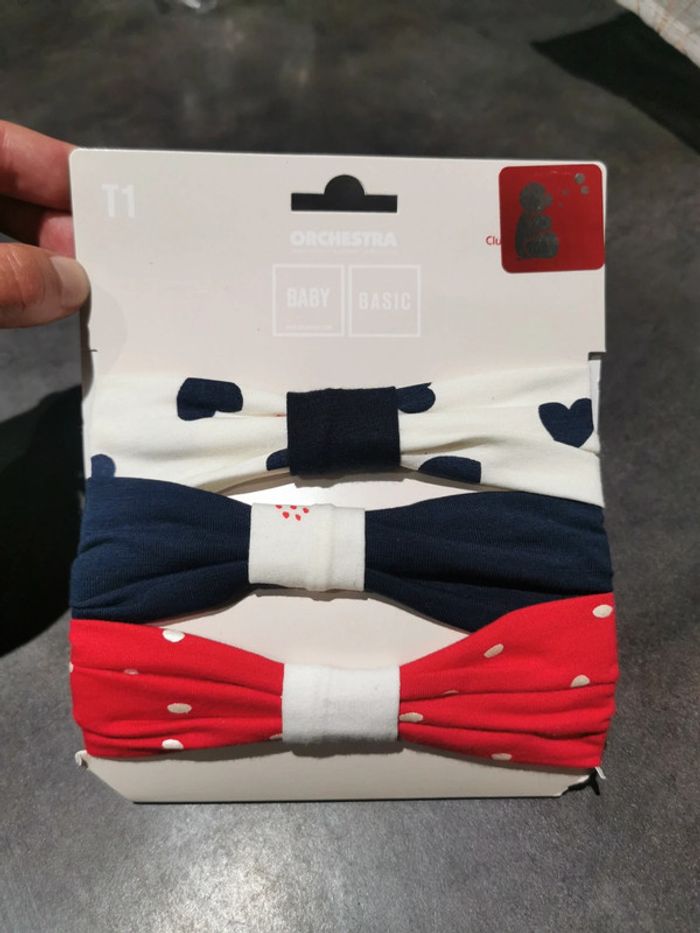 Lot de 3 bandeaux fantaisie avec plusieurs couleurs rouge, blanc et bleu marine et plusieurs motifs. Effet resserré à l'avant. 94% coton et 6% élasthanne. Marque Orchestra. Neuf avec emballage d'origine, parfait pour offrir. Taille 1 de la marque Orchestra soit 3 à 9 mois.