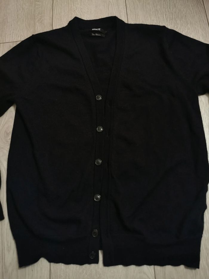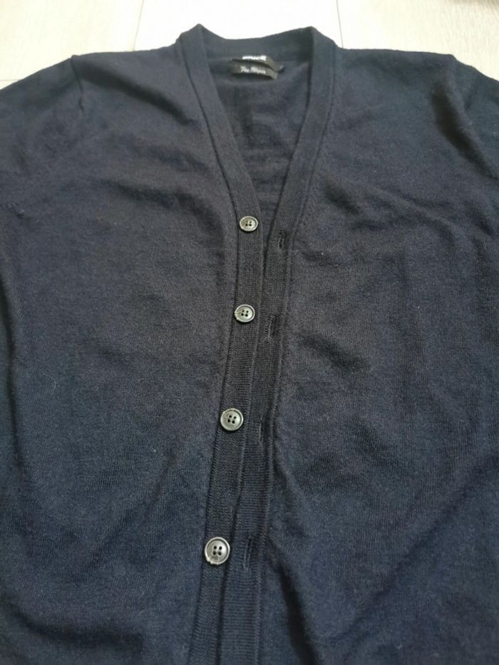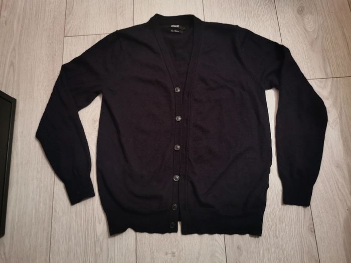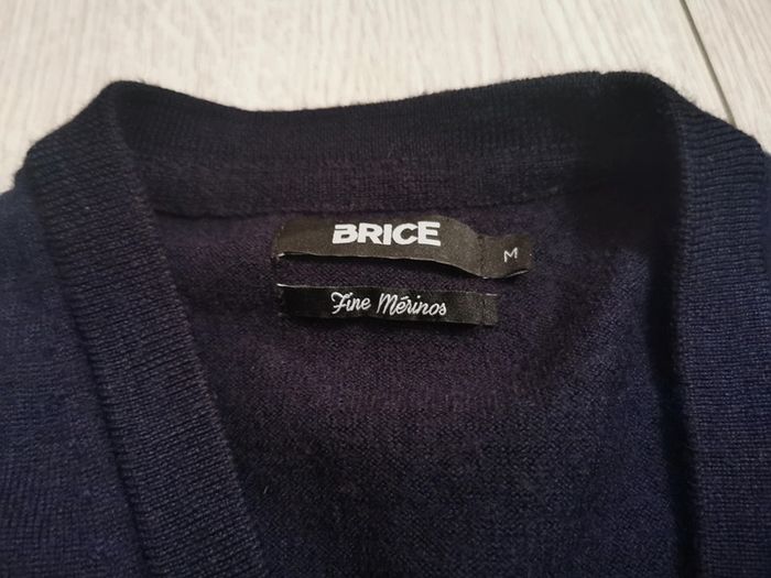 Gilet cardigan boutonné pour homme. Matière de qualité, marque Brice et taille M. Couleur comprise entre noir et bleu marine foncé. Fabrication en laine vierge fine mérinos, en parfait état car porté une seule fois. La laine mérinos est légère, infroissable, durable et neutralise les odeurs. Elle régule aussi la température corporelle en évacuant l'humidité. Pour info complémentaire, il mesure un peu plus de 60cm de longueur depuis le col et taille assez petit pour du M.