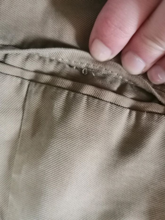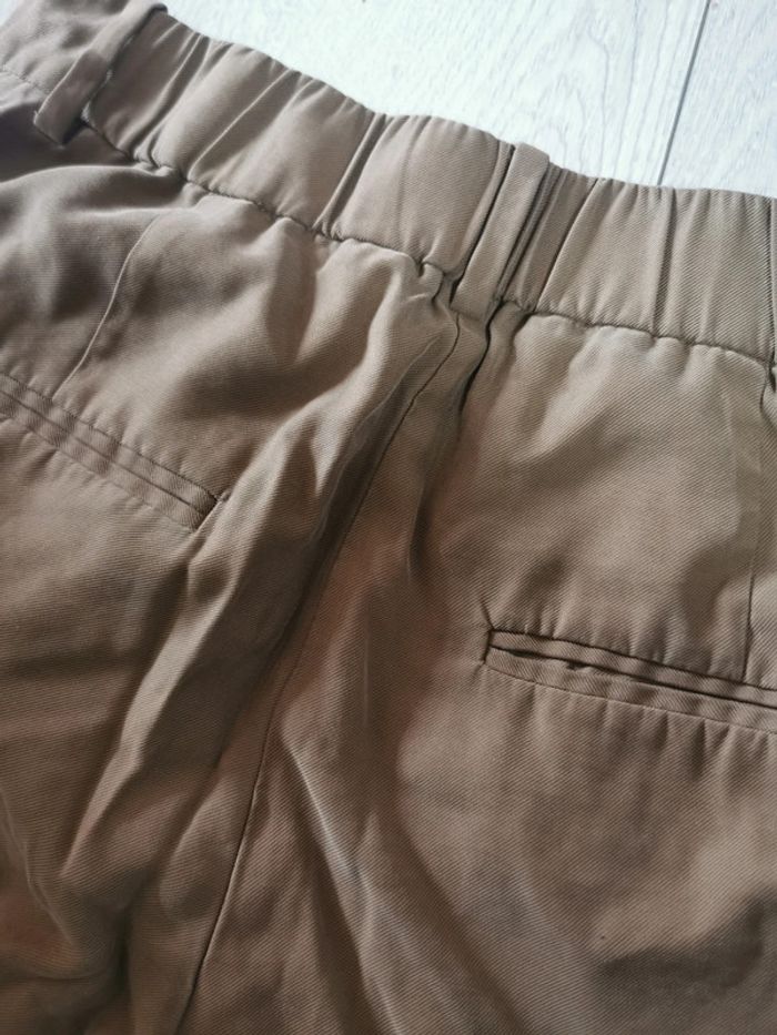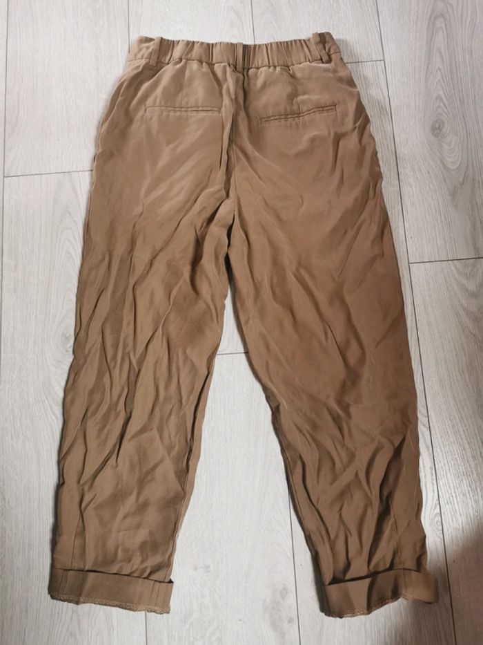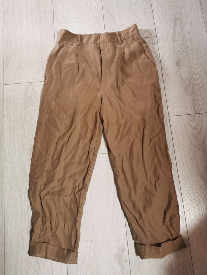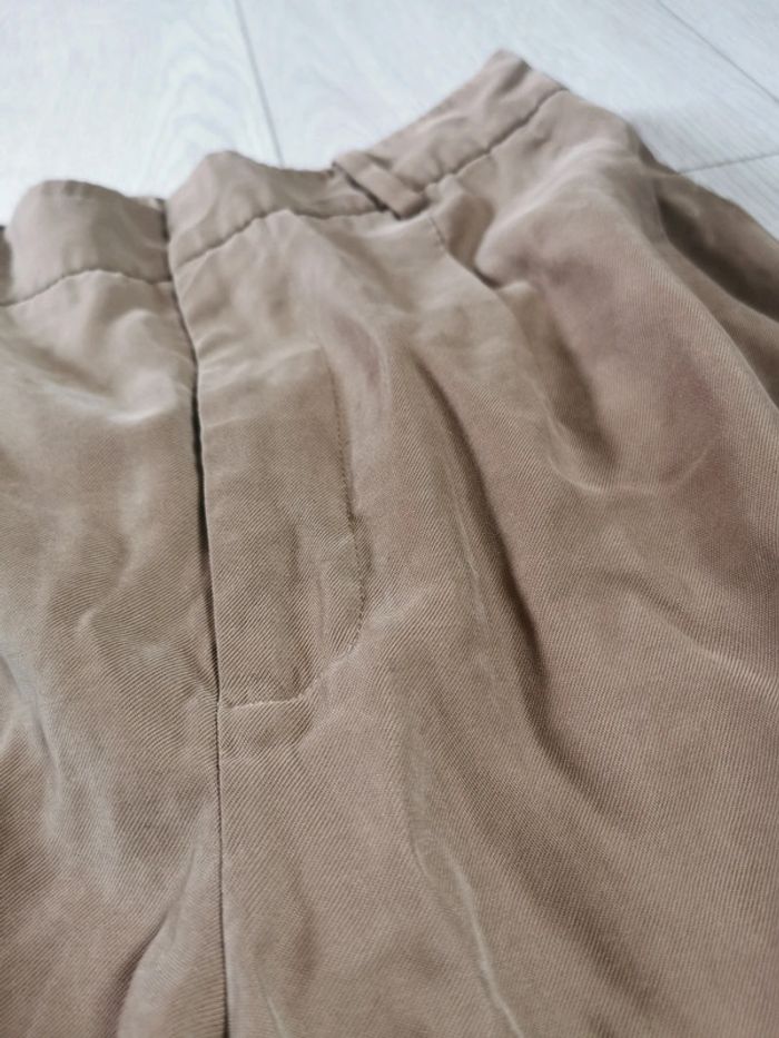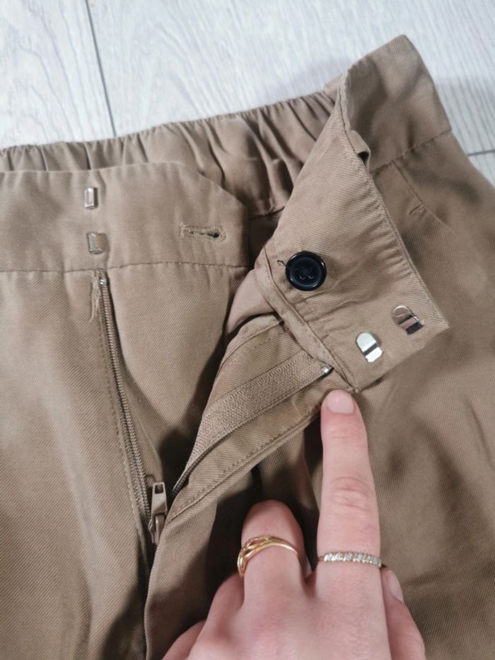 Pantalon fluide avec double fermeture et taille haute et élastique. Légèrement satiné, le tissus est fluide et beige marron avec effets de brillance. Pas d'étiquette de taille ou de composition, je dirai qu'il convient sans problème à un 36/38. Plusieurs poches dont celles à l'arrière encore cousues. Aucun défaut, porté et bien entretenu. Peut évidemment être repassé avant l'envoi si demandé par l'acheteur.