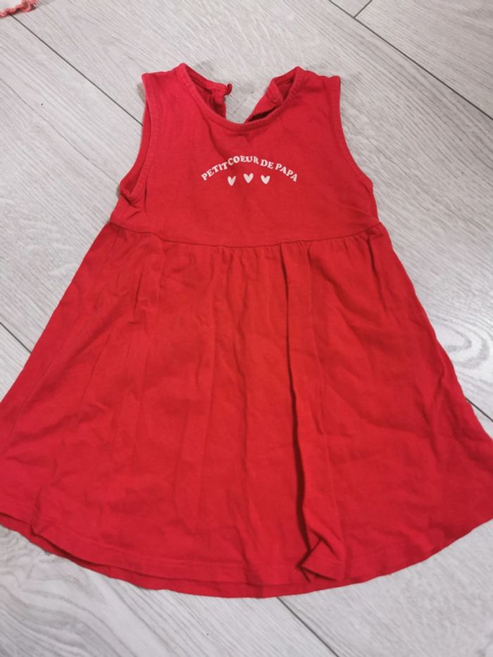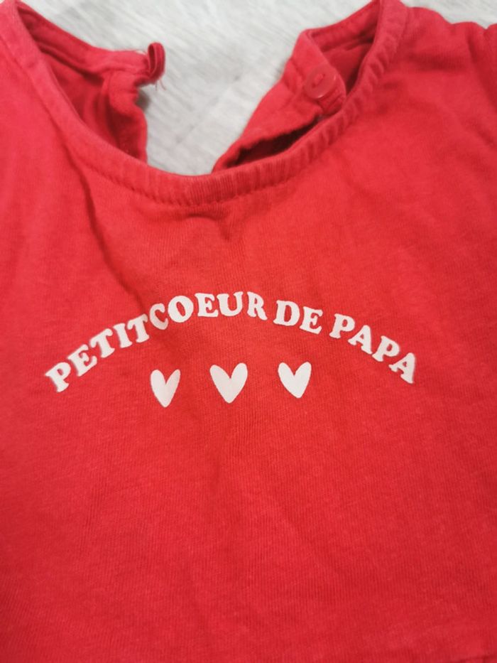Robe coton rouge avec message "Petit cœur de papa" avec des cœurs. Kiabi, 12 mois. Parfait état.