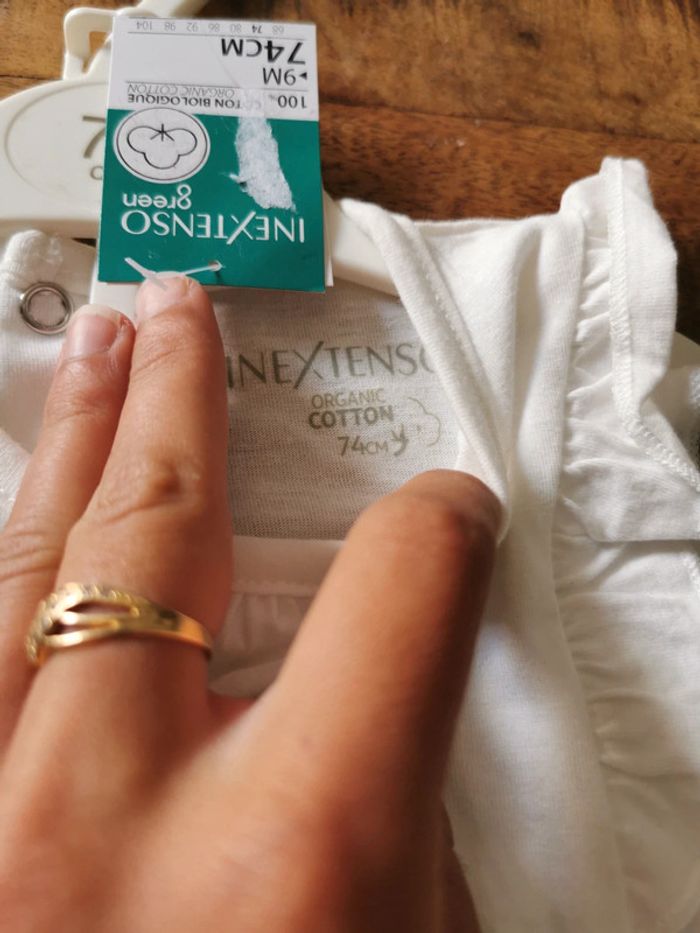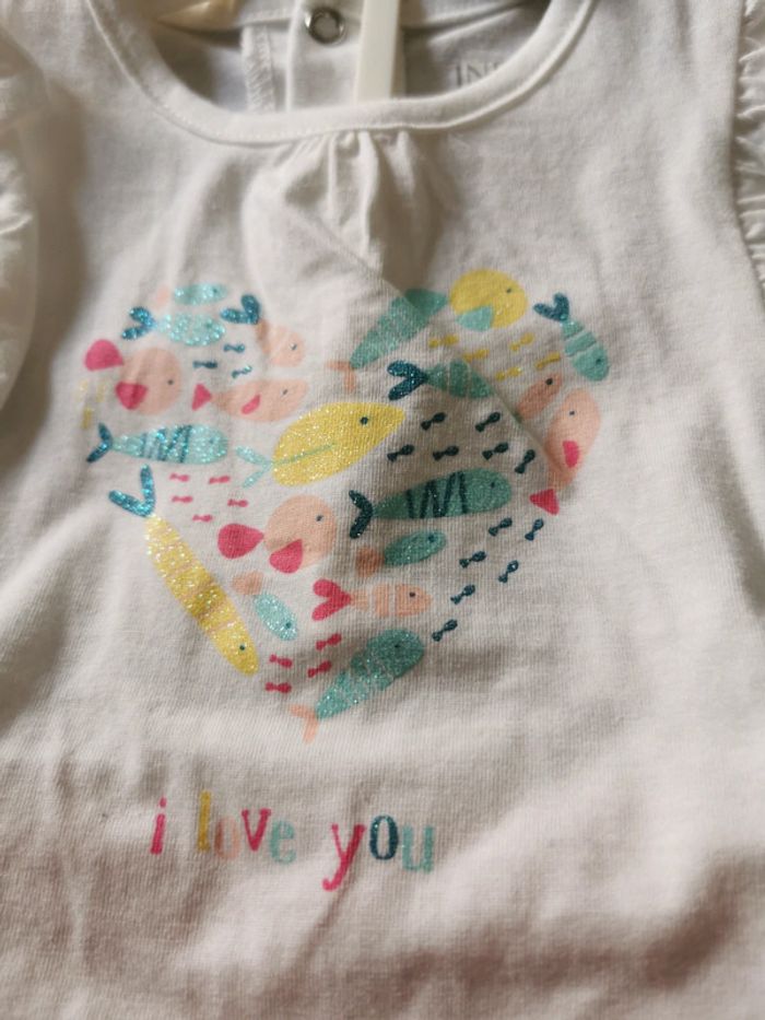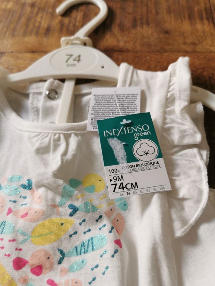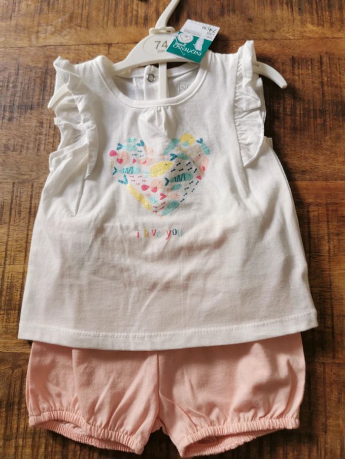 Ensemble neuf avec étiquette, composé du t shirt blanc avec motifs pailletés et short rose clair assorti. Peut être vendu avec le ceintre. Neuf. Coton biologique. Taille 9 mois. Marque In Extenso.