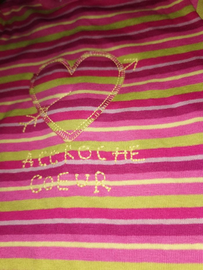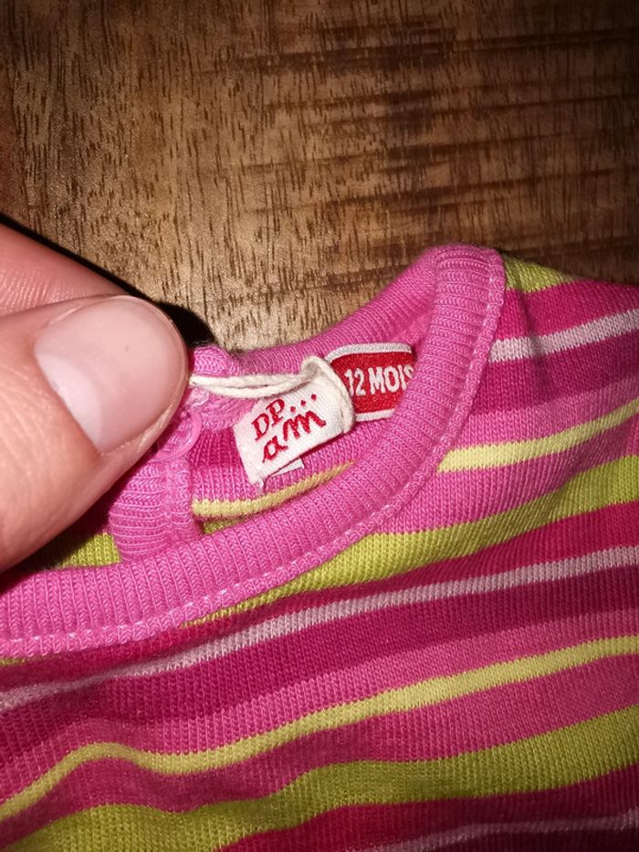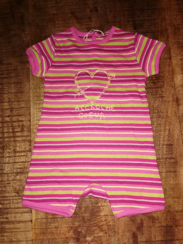 Body neuf DPAM Du Pareil Au Même, avec manches et jambes courtes. Jamais porté. Rayures rose violet et vert. Ouverture à l'arrière. Taille 12 mois.