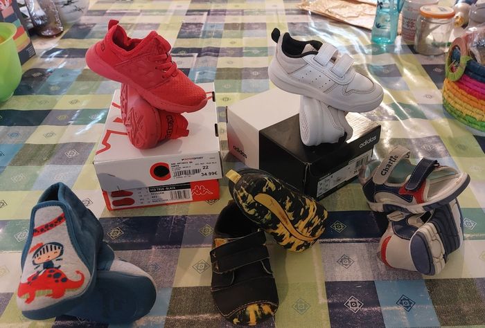 5 paires de chaussures (4 taille 22 et 1 taille 23) Sandale été taille 23 Chausson hiver taille 22 Basket souple decathlon taille 22 Adidas taille 22 quasi neuves Kappa taille 22 neuve jamais portées