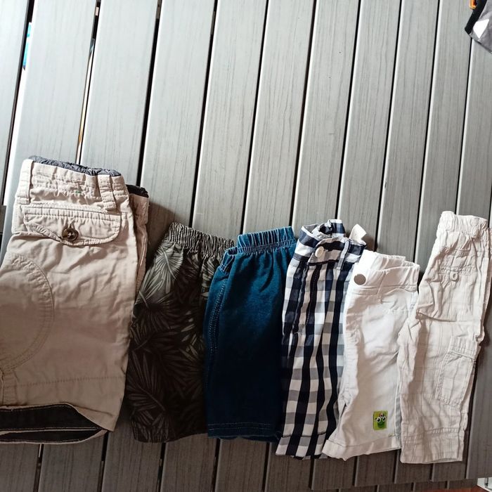 Lot de 6 shorts: -1 beige clair -1 kaki avec dessins -1 short bleu foncé -1 short a carreaux -1 short blanc -1 short beige clair a carreaux Comme neuf Taille: 12 mois Diverses marques