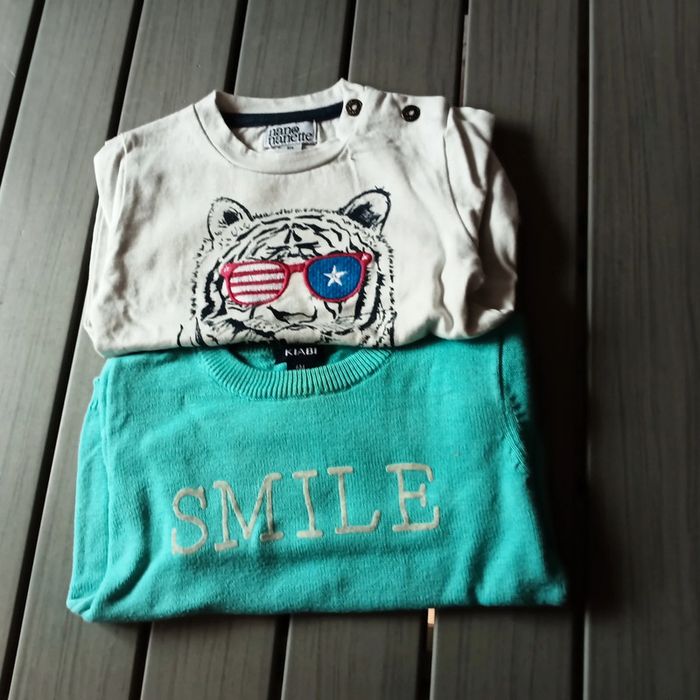 Lot de : 1 haut a manches longues blanc avec dessins 1 pull léger vert d'eau avec inscription Comme neuf Taille :6 mois