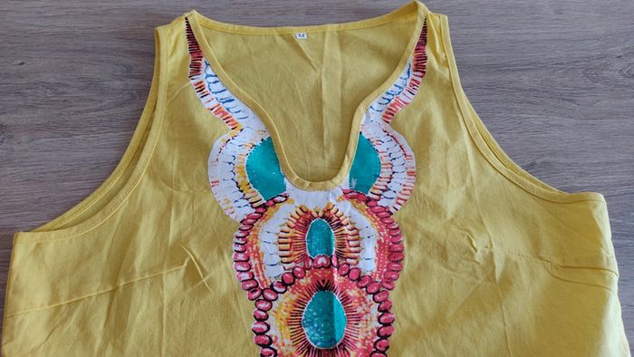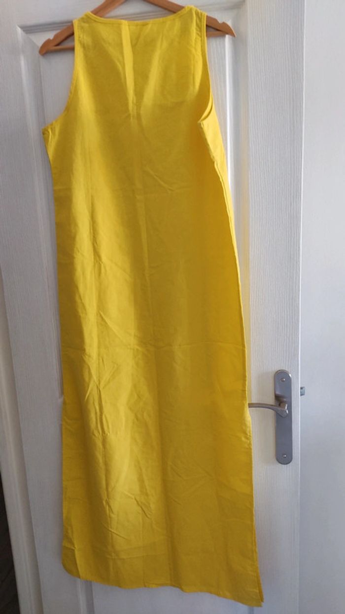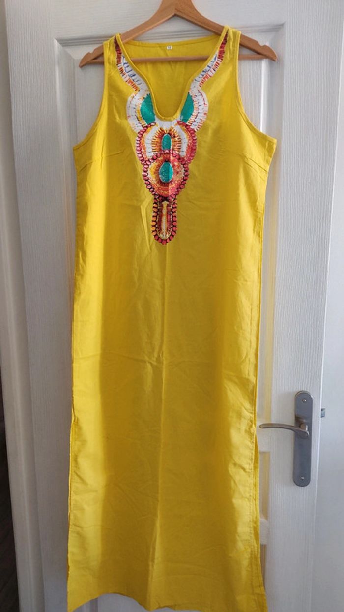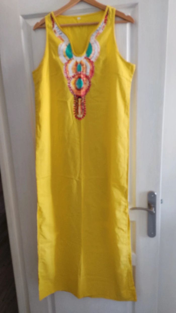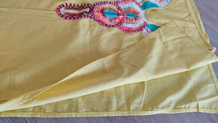 Robe longue coton jaune Taille M Longueur 138 cm Largeur poitrine à plat 47 cm Pinces sur poitrine Motif imprimé Ouverture Bas de robe 56 cm Neuve jamais portée