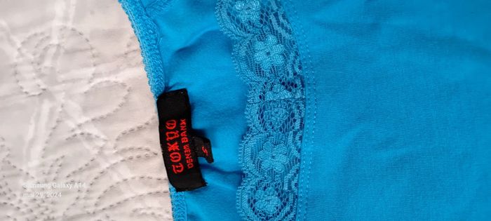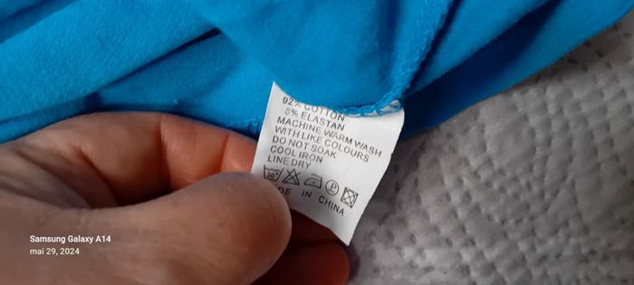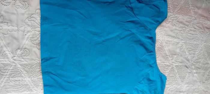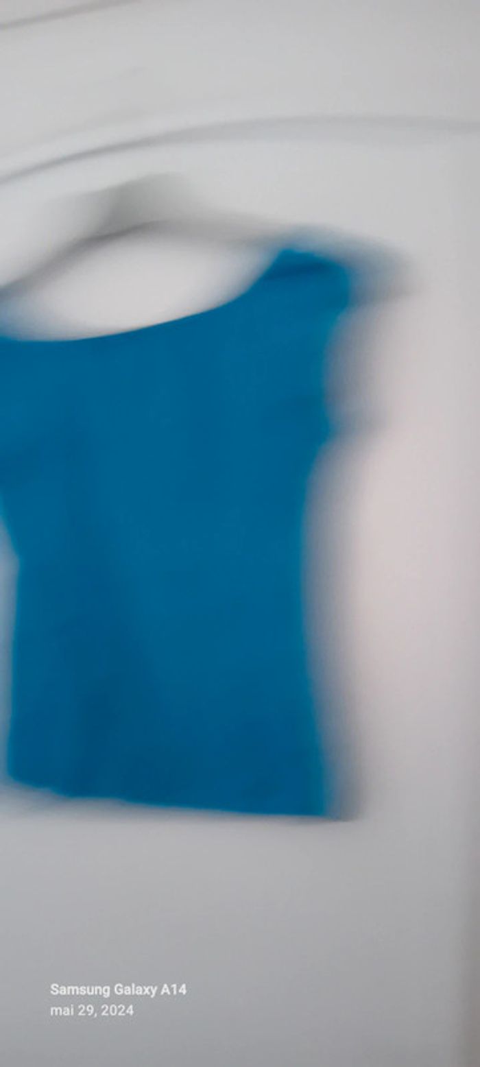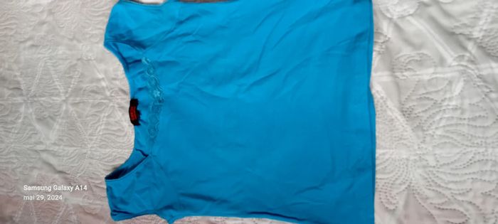 Haut manches très courtes en coton et elastanne extensible avec dentelle au col longueur 43 cm largeur aisselles à aisselles 37 cm made in China peu porté en très bon état #midole #midolefemme #midolefemmeS #midolefemme36 #turquoise #hautfemme36 #madeinchina #hautété #dentelle